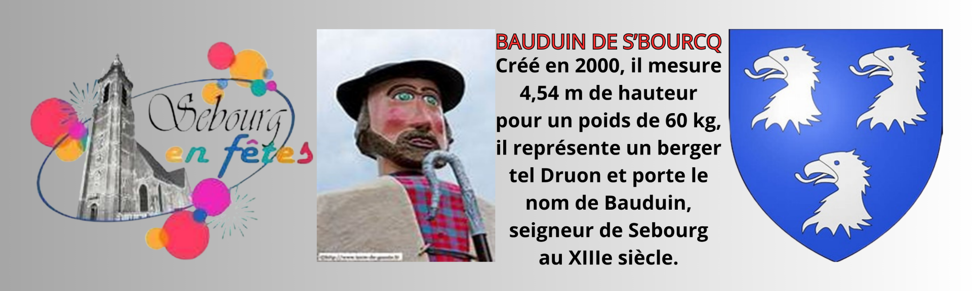 Le roman de Bauduin de Sebourg est une chanson de gestes de 25000 vers en alexandrins, une œuvre poétique et chantée du XIVe siècle dont deux manuscrits sont répertoriés, l’un Bruxelles, l’autre à Paris. C’est à partir de cette chanson que la légende de Bauduin est tirée. Le roi de Nimègue est trahi un jour par Gaufroy, qui épouse la reine Rose. Celle-ci confie son fis Bauduin, âgé de trois ans, au sire de Sebourg. A 17 ans, mesurant douze pieds de haut (3,60 m), il devient célèbre lors d’un tournoi au cours duquel il rencontre la fille du comte de Flandre, Blanche, qui le suivra dans toutes les pérégrinations. Le traître Gaufroy assiège Sebourg. Bauduin s’échappe du château par les souterrains avec sa troupe. Il délivre Blanche, prisonnière des sarrasins, grâce au Saint-Sang et affronte en combat singulier Gaufroy, finalement pendu. Bauduin et Blanche partiront alors pour Jérusalem aux fins de lutter contre les infidèles. La Légende de Bauduin de SebourgTelle est la légende de Bauduin de Sebourg qui donnera son nom au Géant du village. Bauduin de Sebourg est une figure emblématique, un héros de contes et de traditions locales qui, à travers les âges, a incarné courage et grandeur. Sa légende, transmise de génération en génération, est profondément ancrée dans l’identité du village. Le Géant, qui porte fièrement son nom, est bien plus qu’un simple symbole : il est le gardien des récits d’autrefois, un rappel vivant de l’histoire et des valeurs qui unissent la communauté. Célébré lors de fêtes, il illustre le lien fort entre mémoire collective et patrimoine local.Le Géant de Sebourg : Une Tradition RevitaliséeC’est à la toute fin du 20e siècle que des habitants de Sebourg, profondément attachés à leurs racines culturelles, ont décidé de redonner vie à une tradition ancienne et emblématique. Fidèles aux coutumes populaires régionales et locales, ils ont conçu un géant, figure symbolique et ambassadeur de leur commune. Ce projet ambitieux, nourri par l’histoire et le patrimoine sebourgeois, incarne l’esprit chaleureux et festif de la région. Le géant de Sebourg n’est pas seulement une création artistique, il est un véritable lien entre les générations, un porte-drapeau des valeurs communautaires et un témoignage vivant de l’identité sebourgeoise.Bauduin de S’bourcq : Une Figure Emblématique du Patrimoine VivantRejoignant la grande famille des 500 géants processionnels du nord, reconnus et classés au patrimoine culturel immatériel de l’humanité par l’UNESCO, « Bauduin de S’bourcq » est une création marquante qui a vu le jour en l’an 2000. Ce géant, symbole de tradition et de célébration, a fait sa première apparition publique lors du 17° SEBOURG JOIE, le 3 septembre 2000, un événement unique qui marquera le jour officiel de sa « naissance ». Ce moment mémorable restera gravé dans l'histoire de cette célébration, rassemblant passionnés et curieux autour d'une occasion spéciale. Ce fut une journée consacrée à la nouveauté, à la joie et à la créativité, faisant du 17e SEBOURG JOIE un point de repère incontournable, marquant ainsi le début de sa contribution au riche héritage culturel de la région. Depuis, il incarne fièrement les valeurs et l’histoire vivante du Nord, perpétuant un art populaire séculaire, tout en rassemblant les générations autour d’un patrimoine communal.